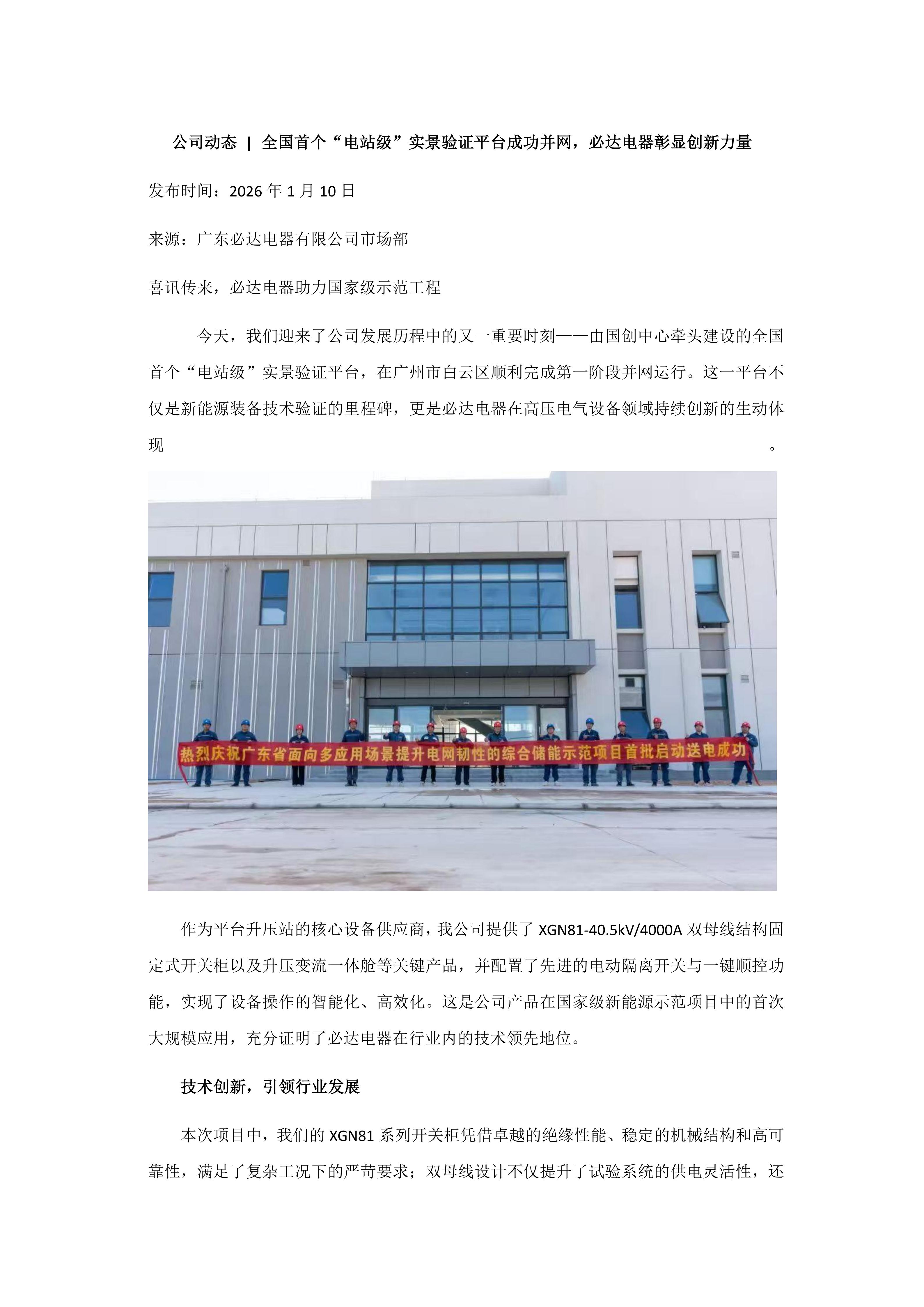 全国首个“电站级”实景验证平台成功并网,必达电器彰显创新力量